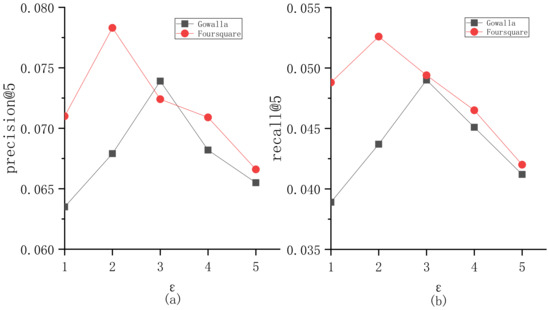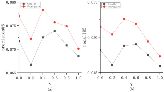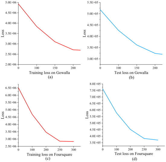 We adopt Gowalla and Foursquare datasets, which are widely used LBSN datasets. Following the preprocessing performed by a previous work [47], we remove the users who have less than 10 check-in records or have checked in less than 5 POIs and POIs that have been visited by less than 10 users. Afterward, we gain the datasets as shown in Table 2. The Gowalla dataset contains 301,191 check-in records where there are 4159 users, 24,919 POIs, 225 categories, and a 0.291% density. The Foursquare dataset contains 289,467 check-in records, where there are 3475 users, 21,657 POIs, 157 categories, and a 0.385% density. To evaluate the performance of our proposed model, we randomly select 80% check-in records from each user as the training set and the remaining 20% as the testing set. In the training and test processing, our proposed model takes about 200 epochs and 250 epochs to converge steadily on Gowalla and Foursquare for each run, which is analyzed in Section 4.5.