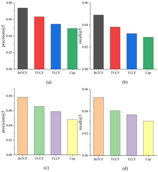 BiTCF is combined with trust-user-based collaborative filtering (TUCF), trust-location-based collaborative filtering (TLCF), and POI category-enhanced historical preference (CaP) modules. To evaluate the effectiveness of the above three modules, we implement the ablation experiment and the results are shown Figure 9. TUCF achieves a better performance compared with TLCF and CaP, and TLCF is superior to CaP.