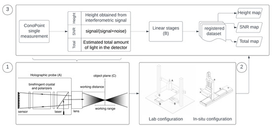 The sketch in Figure 1 exemplifies the idea behind our prototype and this work, depicting hardware and data modules. Below, we firstly describe the optical scanning microprofilometer, focusing our attention on the performance analysis of the conoscopic holography probe. Secondly, we detail the multiple dataset acquisition and the novel microprofilometry data pipeline.