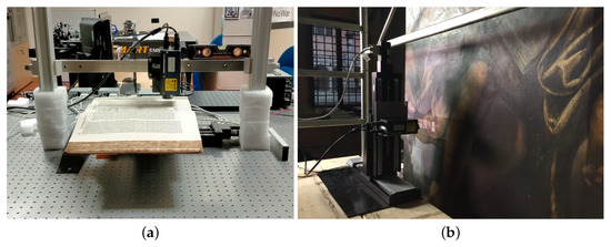 Figure 2. Microprofilometer applications on genuine case studies. (a) Laboratory configuration: microprofilometer on the optical table while scanning an ancient book. (b) In situ configuration: microprofilometer scanning an ancient large canvas painting by Tintoretto in the Church of the Frari in Venice, further explored by the authors in [19].