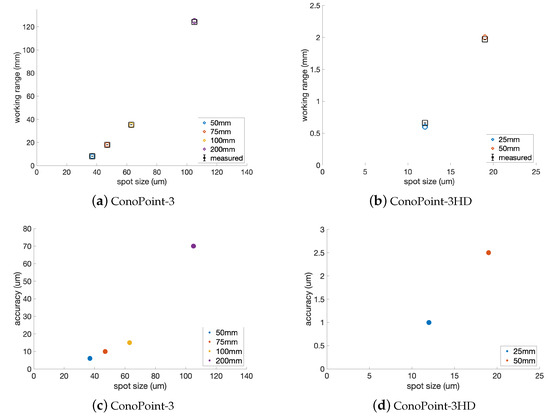 Figure 3. Performance analysis of the different lens-probe coupling. (a,b) Working range variation versus laser spot variation. The working range has been measured on a flat diffusive standard, the nominal value is also reported. (c,d) Dependence of depth accuracy on laser spot. Setups: ConoPoint-3 (lenses: 16 mm, 50 mm, 75 mm, 100 mm, 200 mm); ConoPoint-3HD (lenses: 25 mm, 50 mm).