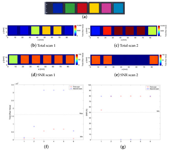 Figure 4. Feasibility test on a colorchecker. (a) Visible image of the acquired ROI. (b,c) Map of the Total values obtained with two optimized power settings. (d,e) Map of the SNR obtained with two optimized power settings. (f,g) Value of the Total (left) and of the SNR (right) averaged over the single color patch, with the acceptance threshold indicated; the x-label indicates the column in the colorchecker. Profilometer setup: 50 mm lens, 25 μ m scan step, 10 mm/s scan velocity.