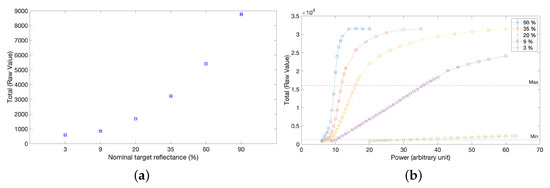 Figure 5. Linearity test on diffusive reflectance standards. (a) Variation of the intensity signal Total with respect to the change in target reflectance for a fixed power configuration (course power (arbitrary unit) set at 9, 16 fine power). (b) Variation of the intensity signal Total as the laser power varies and as the target reflectance varies.