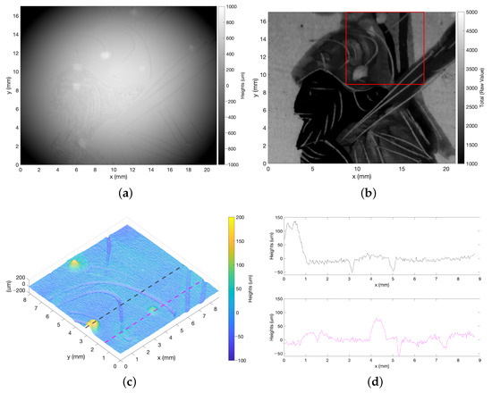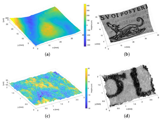 Figure 6a,c show that the microprofilometer effectively acquired the microsurface z ( x , y ) allowing to capture the deformation (i.e., the waviness) and the roughness of the paper support, but the lack of references in the height data raises difficulties in the interpretation. The use of the raw intensity signal map t ( x , y ) solves this problem. Figure 6b,d report that, as a result, the Total values mapped on the corresponding surface height map, thus creating a new representation of the surface as intensity total function t ( x , y , z ) . The relevance to turn the surface “visually readable” is evident. In fact, the combination of the intensity-height datasets allows a visual inspection of the surface through the Total function and a quantitative supervised analysis through the surface heights map.
