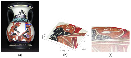 As a further result, Figure 8 reports the fusing of a visible image of the vase onto the metrological shape provided by microprofilometry. The ROI was extracted from the visible photograph and registered with the Total map shown in Figure 7b, which turns out to be mutually registered with the heights map. The registered image was then mapped onto the point cloud obtained from the height dataset, achieving the final result shown in Figure 8b,c. The polychrome surface texture can be appreciated in the zoomed detail.