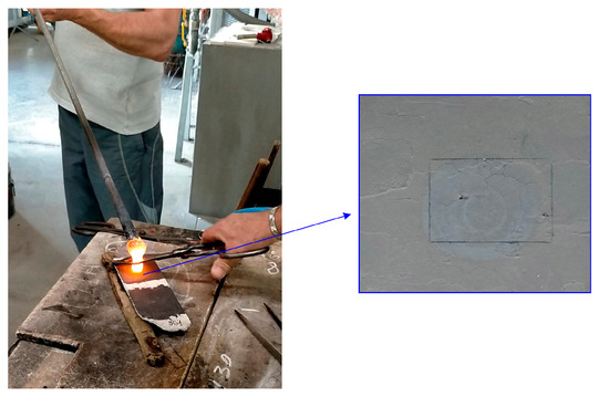 Figure 9. Melt deposition on the surface of the sample in the traditional hand-made process of art glass production. On the right, the spot caused by the melt-mold interaction.