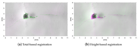 The advantage of performing the registration on the Total maps is evident when we compare the results with those obtained by working on the heights domain. Figure 10 shows an example of the registration of a representative ROI (before/after the treatment) using the standard Matlab algorithm imregister [31]. In this specific case, we found a root mean square error (RMSE) of 18 μ m and 26 μ m for the total-based and the height-based registration, respectively. In the latter, the loss in accuracy is evident along the cracks, with a displacement of ∼140 μ m for the height-based. Clearly, the multi-temporal monitoring of surface metrology parameters is not reliable without an accurate registration of the heights maps.