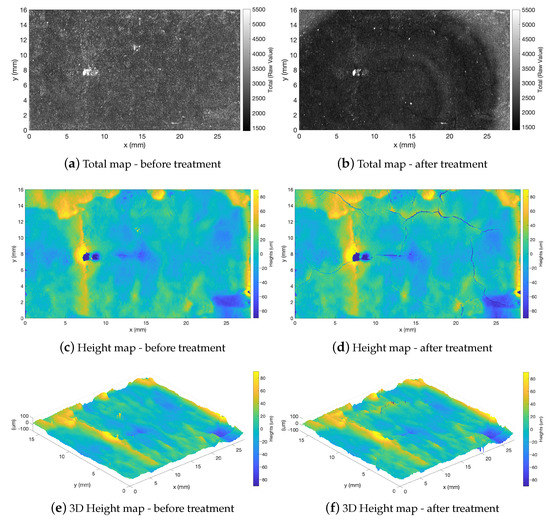 The total maps t ( x , y ) are used as intensity-based images to find the geometrical transformation that allows for an in-plane registration of the profilometer datasets. The total map after the treatment is registered with the total map before the treatment, taken as reference; the found transformation matrix is then applied to the height dataset in order to achieve two spatially registered surface height maps.