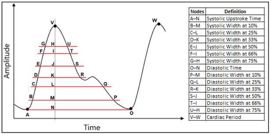 - Ratio of diastolic width to systolic width at 10%, 25%, 33%, 50%, 66% and 75% of the pulse height.