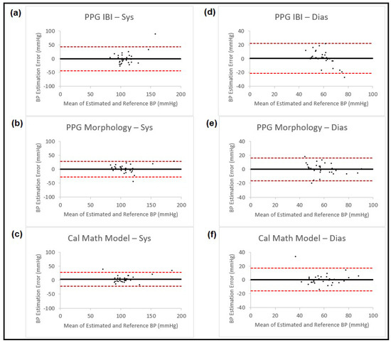 Bland–Altman plots presenting systolic and diastolic blood pressure estimation using three different sets of features from PPG waveforms (IBI and morphology, IBI and calibrated mathematical model and IBI, morphology and calibrated mathematical model). The left column (a–c) shows the results for systolic BP and the right column (d–f) for diastolic BP. Each of the plots is named accordingly. In all the plots, the black horizontal line is the bias and the two dashed red lines are the 95% limits of agreement.