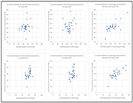 The resulting correlation coefficients showed that while there is a low level of correlation between the estimation results from IBI and morphology or IBI and the calibration method, the blood pressure estimation values from morphology and calibration methods are highly correlated. Correlation results were similar for both SBP and DBP. These correlations are shown in Table 4 and the scatter diagrams are presented in Figure 7.