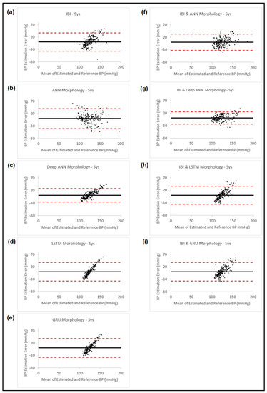 Bland–Altman plots presenting systolic blood pressure estimation using different methods: (a) Estimation using PPG dynamics features and ANN model; (b) Estimation using PPG morphology features and ANN model; (c) Estimation using PPG morphology features and feedforward deep NN model; (d) Estimation using PPG morphology features and LSTM model; (e) Estimation using PPG morphology features and GRU model; (f) Estimation combining the estimated BP result from (b) and PPG dynamics and use them in ANN model; (g) Estimation combining the estimated BP result from (c) and PPG dynamics and use them in ANN model; (h) Estimation combining the estimated BP result from (d) and PPG dynamics and use them in ANN model; (i) Estimation combining the estimated BP result from (e) and PPG dynamics and use them in ANN model. In all the plots, the black horizontal line is the bias and the two dashed red lines are the 95% limits of agreement.