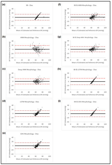Bland–Altman plots presenting diastolic blood pressure estimation using different methods: (a) Estimation using PPG dynamics features and ANN model; (b) Estimation using PPG morphology features and ANN model; (c) Estimation using PPG morphology features and feedforward deep NN model; (d) Estimation using PPG morphology features and LSTM model; (e) Estimation using PPG morphology features and GRU model; (f) Estimation combining the estimated BP result from (b) and PPG dynamics and use them in ANN model; (g) Estimation combining the estimated BP result from (c) and PPG dynamics and use them in ANN model; (h) Estimation combining the estimated BP result from (d) and PPG dynamics and use them in ANN model; (i) Estimation combining the estimated BP result from (e) and PPG dynamics and use them in ANN model. In all the plots, the black horizontal line is the bias and the two dashed red lines are the 95% limits of agreement.
