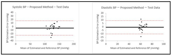 This model was chosen based on the results achieved from earlier experiments in Section 3.2, which showed that the feedforward deep neural network model gave the best performance among the methods that were used. This allowed us to have a calibration-free model that can be used to estimate both SBP and DBP. We then trained the model on 200 signals that were used in Section 3.2. The trained model was used to estimate blood pressure values for the 25 new patients. The estimation results and the related errors are shown in Table 6, with the corresponding Bland–Altman plots shown in Figure 11.