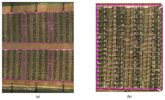 Top view of the field of the study in Rosemount, Minnesota: (a) aerial image of the entire experiment, blocks 2, 3, and 6 were inoculated, and the other blocks 1, 4, and 5 were sprayed with fungicide; (b) one P. graminis-inoculated block with a superimposed coefficient of infection values.