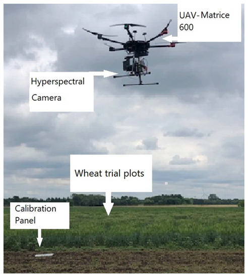 Spectral image data were collected in the field by a UAV (Matrices 600 Pro, Hexacopter, DJI Inc., Shenzhen, China) (Figure 2) and a hyperspectral imaging system (Resonon, Inc., Bozeman, MT, USA); the flight computer (Resonon NUMI, flight code version 1.36) was attached to the camera system had a 33° field of view. The images were uploaded from the flight computer to the desktop by using a cable. Resonon Pika ll g visible and near-infrared camera and spectral range (400–900 nm) is a “push-broom” or line-scan type imager that produces a 2-D image with spectral resolution 2.1; the spatial channel is 640 and spectral channel 240, where every pixel in the image contains a continuous reflectance spectrum. The HS camera also included an inertial measurement unit (IMU; Ellipse2-N, SBG Systems, Carrières-sur-Seine, France), a single band GNSS (Global Navigation Satellite System) antenna (TW2410, Tallysman, Inc., Ottawa, ON, Canada). The camera’s orientation was controlled by a three-axis gimbal (Ronin-MX, DJI, Inc., Shenzhen, China). Ground elevation was maintained before flying by a level scale to ensure the camera was in the correct position. The UAV and HS camera were powered by individual lithium polymer batteries, that were used for each piece of equipment in the system.