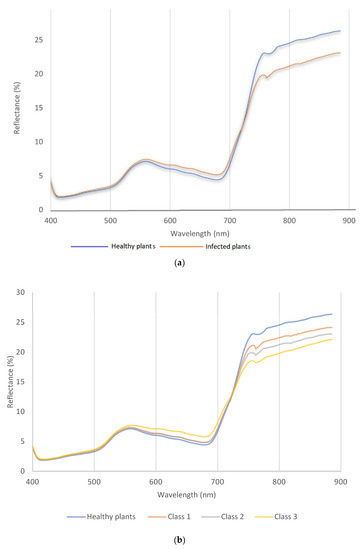 The spectral reflectance curve for wavelength vs. reflectance of wheat plants in stem-rust-inoculated blocks and wheat plants in the fungicide-treated blocks (healthy plants) for (a) binary classification and (b) multiclass (class 1, 2, and 3).