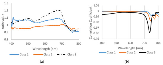The correlation coefficient of class 1 and class 2 was almost identical until 700 nm, then the correlation started to change and drop down, but they looked to have the same pattern (Figure 4b). Class 3 showed a different pattern than other classes, so it had a lower correlation value in all bands, especially in 735 nm. The linear correlation coefficient also supported the previous result and showed wide differences between class 3 and two other classes. In reality, the wheat plants showed severe symptoms in class 3, which impacted the spectral reflectance. In general, in remote sensing, the maximum and minimum of some spectral values were shown in some curves and gave a good indicator that spectral reflectance had been changed based on plant symptoms. This process can be very helpful for breeders to evaluate and monitor plants in different varieties, such as tolerant, mild, and susceptible. If this technique is applied in a field application, it will be an important scientific breakthrough.