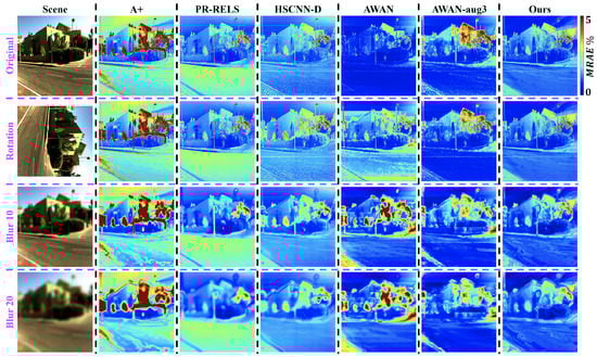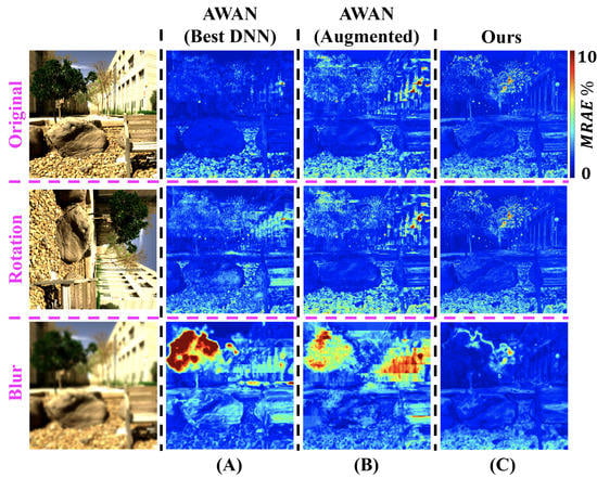 The SR mean-relative-absolute error (MRAE) maps of (A) the leading deep neural network (DNN) “AWAN” [35], (B) our data-augmented AWAN and (C) our pixel-based “A++”, under the original, rotation and blur conditions. The error maps of the “rotation” experiments are rotated back to upright orientation to ease comparison.