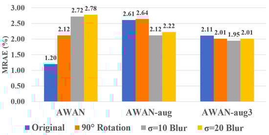 As shown in the left-most result in Figure 3, on average, the non data-augmented AWAN works well on the original image, but has almost twice as much error for rotated images and performs even worse on blurred images. With data augmentation (the middle “AWAN-aug” result), we see that the model delivers a more stable performance across different conditions but at a worse overall performance level.