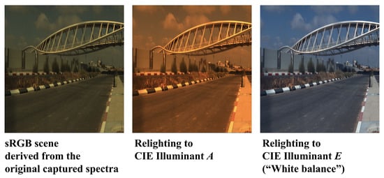 The corresponding RGB images are derived from the hyperspectral images using Equation (2), with CIE 1964 color matching functions [59] as the spectral sensitivities.