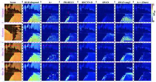 CIE Illuminant E scene relighting error heat maps in . The ground-truth relighted scene is shown in sRGB in the leftmost column. From the top to the bottom row, the tested imaging condition is in turn the original, rotation, and two Gaussian blur conditions.
