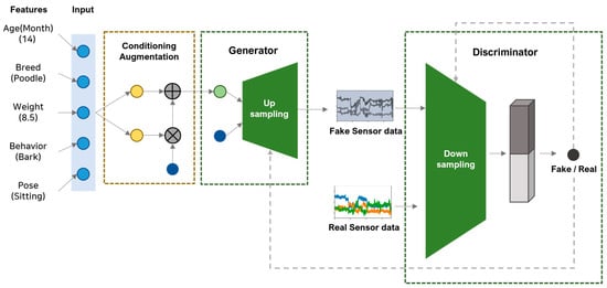 Data were generated using a generative model to augment multidimensional time-series data. The text data were received as input values, and the input behavioral data were augmented using word embedding based on the experimental group which was most similar to the input value. The input values included gender, age (in months), breed, weight, and behavior. Then, these variables were converted into dense vectors using word2vec. Weight values were adjusted on variables that affected pet activity after establishing internal criteria based on veterinary papers [34,35]. A vector value was calculated based on weights of 0.5 for the breed, 0.4 for age, and 0.1 for gender. The behavioral input was augmented based on the sum of the embedding vectors calculated through word2vec based on the most similar experimental group. Behaviors were converted into one-hot vectors to classify input behaviors separately. Afterward, data augmentation proceeded by receiving the biased behavior or the behavior requiring augmentation as the last input value.