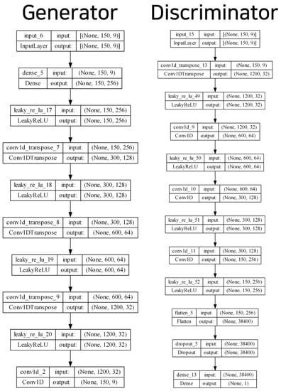 Figure 2 presents the overall process of the generative model, and Figure 3 displays the model structure of the generator and discriminator of the TN-GAN. The input layer of the generator model comprised (150, 9); we derived these values based on sensor data lengths of one sequence of 150 s and the gyroscope, accelerometer, and geomagnetic field values, consisting of x, y, and z, respectively. Then, the upsampling structure of the stackGAN was implemented using the stacking 1D CNN layers. The leaky rectified linear units (ReLU) activation function was used, and fake sensor data were created in the form of (150, 9). The discriminator model received data in the form of (150, 9) and was created using a generator that passed through a 1D CNN layer and leaky ReLU with a downsampling structure. Finally, the neurons were spread through the flattened layer and, using the dense layer and softmax function, the discriminator model determined whether the generated data were fake or real with a value from 0 to 1.