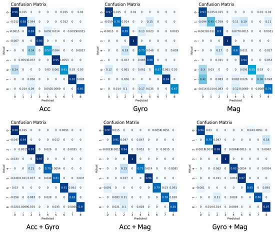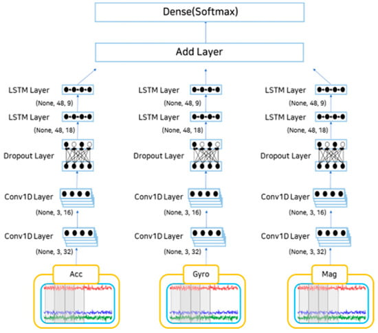 The sensor data employed as input values were not calculated immediately but were divided into values from a three-axis accelerometer, three-axis gyroscope, and three-axis geomagnetic sensor. After receiving each set of three-axis data as input values and applying a 1D CNN layer, the size of the existing filter was reduced by half, and the CNN of the downsampling process was performed again. After passing the dropout layer to prevent overfitting, the LSTM layer proceeded in the same way as in the CNN. The layer was added after completing the calculation up to the LSTM layer for each sensor. The dense layer for multiclassification and behavior was classified using the softmax function, and the performance was measured through indicators for the predicted behavior based on the actual behavior.