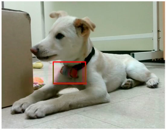 Wearable device example in the red rectangle on a dog.