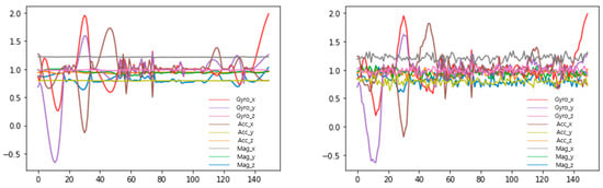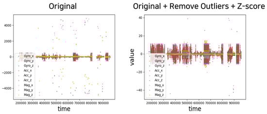 Outlier removal and data normalization were performed based on the collected nine-axis sensor dataset. Figure 9 illustrates the original data and results after preprocessing. Then, cubic spline interpolation was applied to the preprocessed training data. The standard for one behavior was calculated as 3 s, and the sensor data were collected at 50 Hz; thus, the length of sensor data constituting one sequence was 150 s. Interpolation was performed for sequences in which 10% of the length had fewer than 15 missing values.