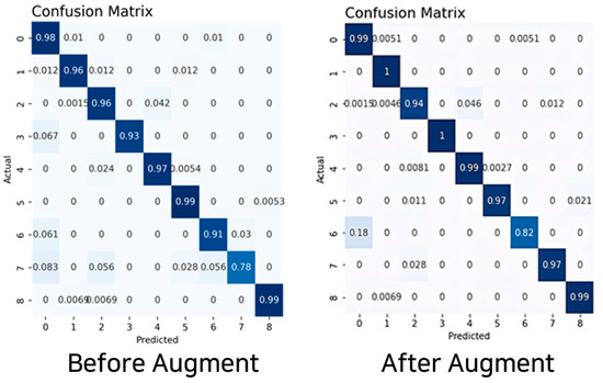 The experimental results reveal that nine-axis sensor data using the accelerometer, gyroscope, and geomagnetic sensors performed the best. The augmented dataset using the TN-GAN model displayed the highest accuracy at 97%. All training models used a CNN-LSTM hybrid model, and the results indicated that the best performance was attained on the basis of hyperparameter tuning rather than using the same hyperparameters for each dataset. The result of the behavioral prediction accuracy, attained based on the CNN-LSTM model and derived using the augmented nine-axis sensor data, was 97%; the recall and F1-score values were the same. Table 7, Figure 11 and Figure 12 provide the prediction results for behavioral classification.