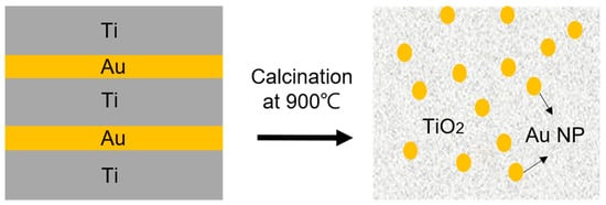 Schematic of example multilayered film stack to achieve uniformly distributed Au NP in the TiO2 matrix after calcination.