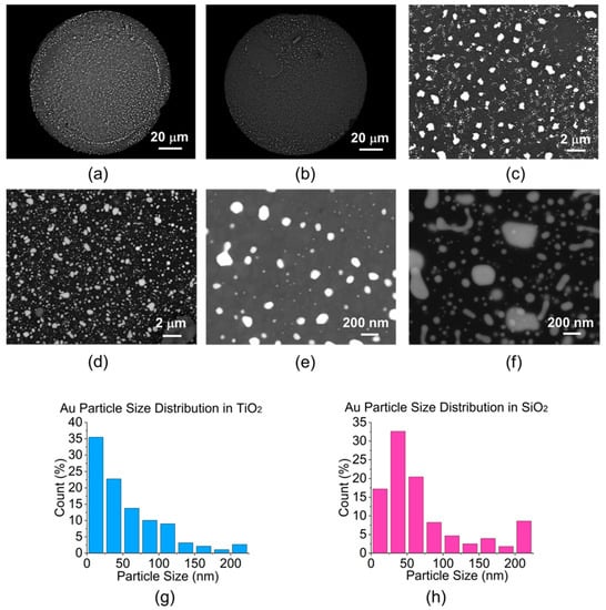 Low-vacuum backscattered-electron SEM images of (a) Au/TiO2 and (b) AuSiO2 of a fiber sensor tip. Uniform Au particle distribution at the surface of (c) TiO2 and (d) SiO2. Spherical inclusions of Au NP in (e) TiO2 and (f) SiO2 at the nanoscale, with SiO2 showing more diverse shapes of elongated Au particles. Au NP size distribution in (g) TiO2 and (h) SiO2 matrix.