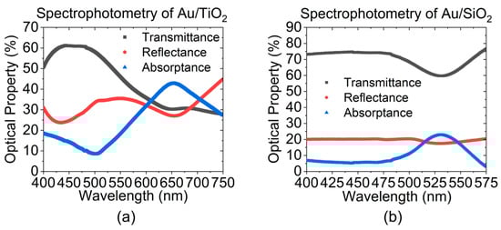 Spectrophotometry of (a) Au/TiO2 and (b) Au/SiO2 nanocomposites on planar quartz substrates showing representative LSPR absorption bands in the visible range.