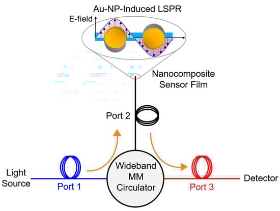 Optical circulator configuration of reflection-based sensor probe with fiber tip functionalized by Au-incorporated nanocomposite that shows LSPR absorption features. Conceptually, the purple arrows indicate the coherent oscillation of free electrons in Au NPs with charge separation, while the blue surface represents the oxide matrix surrounding the Au NPs.