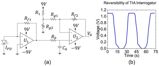(a) Circuit diagram of the dual-stage transimpedance amplifier. (b) Reversibility of low-cost interrogator voltage signal tailored to the baseline reflectance of the reflective fiber sensor.