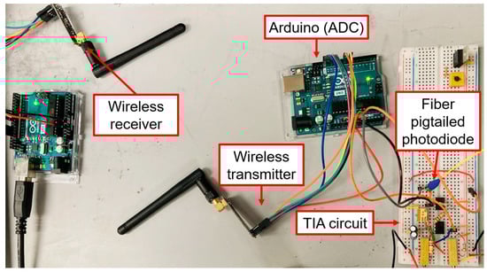 The low-cost interrogator circuit consists of a pigtailed photodiode (FDSP625, Thorlabs), dual-stage amplifiers, two Arduino Uno microcontroller boards, and two wireless transceiver modules (nRF24L01+), with a total build cost of USD 250. The detailed operation principles of TIA was described previously in our work [31]. Here, an updated design of the dual-stage TIA is shown in Figure 6a. A single wavelength fiber-coupled LED (M530F2, Thorlabs) is used as the light source. Briefly, the photocurrent, , from the diode is converted into output voltage, , by the operational amplifier (Op-Amp), and later transmitted by the microcontrollers. The max. and min. of the photocurrent and output voltage define the gain of the Op-Amp, which is also represented by the feedback resistor. The photocurrent change from the sensor is designed to be amplified to the voltage input range of the Arduino analog-to-digital converters (ADC), and a DC offset is added for the minimum current to correspond to the minimum voltage of the ADC. The internal ADC reference voltage of the Arduino is 1.1 V. The dual-stage amplifier consists of a high-gain transimpedance amplifier, , cascaded into a low-gain amplifier, , with filtering and a DC offset [34]. The cut-off frequency of the low-pass filter is defined by and to capture the low frequency of temperature optical response. The DC offset is controlled by resistors and that form a voltage divider, and the gain is customized by resistors , and through two potentiometers. The non-inverting input of takes the voltage produced by the first stage, and its inverting input receives voltage produced by the voltage divider. With the component values chosen, this circuit can provide signal gain between 0.07 V/nA and 0.33 V/nA and up to 90V of negative DC offset. For a proof of concept, the nanocomposite reflection fiber sensor is spliced with the photodiode and integrated with the low-cost customized TIA interrogator to test the voltage output. Figure 6b shows the reversibility of the voltage variations wirelessly transmitted as a function of input optical intensity by manual adjustment of the LED driver over a short period of time. The transmitter-integrated Arduino is programmed to take 100 voltage samples each second and average them to mitigate the noise inherent to a high-gain system. The nRF24L01+ wireless modules communicate with the Arduino through an SPI interface and transmit/receive signals in the 2.4 GHz band. Data is collected and logged from the receiver using the USB interface of the Arduino at a sampling rate of 1 s−1 after the data pre-processing. The entire low-cost wireless interrogator is presented in Figure 7. Two 9 V batteries are connected in series to power the entire interrogator circuit. Alternative power supply options are being considered for future prototypes.
