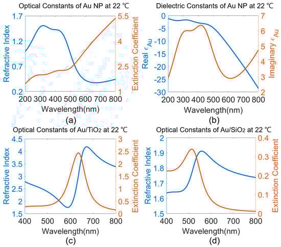 To derive the optical constant models for Au–oxide nanocomposites, Maxwell–Garnet effective medium theory, (8), is used. gives the effective complex dielectric constant of the nanocomposite with Au NP assumed as spherical inclusions for simplicity, where the depolarization factor equals to 1. is the volume fraction of Au NP doped in the oxide matrix. A total of 10 vol% of Au NP is assumed for all simulations in this work due to the temperature sensitivity analysis in our previous work [31] and the mechanical strength of the actual nanocomposite film studied by Rodrigues et al. [40]. Using Equation (8) and the parameters described in Table 1, the resulting optical constants of Au/TiO2 and Au/SiO2 are shown in Figure 8c,d. At the same Au doping level, Au/TiO2 shows a larger extinction coefficient in the anomalous dispersion region than Au/SiO2 due to the larger real index of TiO2 incorporated in the Maxwell–Garnet equation and the lack of an interband electron absorption overlaying the LSPR.