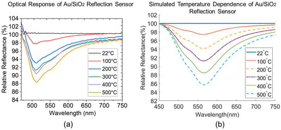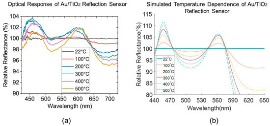The temperature sensing experiments are conducted in real-time using the furnace setup described in Section 2.2. to compare the plasmonic-induced temperature sensitivity of the two reflective nanocomposites and validate against their theoretical performance modeling results. To simulate the spectral baseline of the interrogation software (OceanView 2.0), the comparative modeling results are completed by assuming that 100% of the absolute reflectance of the Au–Oxide reflection sensor modeled at 22 °C is served as the baseline reference. The subsequent temperature-dependent spectra at all elevated temperatures are obtained by dividing the modeled absolute reflectance at those temperatures by the baseline and normalized with a value of 100% to complete the relative reflectance. Figure 10a shows the experimental results of an Au/TiO2 reflection sensor changing as the environmental temperature increases from room temperature to 500 °C. All spectral convex features within the visible region are captured and confirmed experimentally when compared to their simulation counterpart in Figure 10b. The characteristics in the visible range are dominated by the LSPR absorption of Au NP inclusion, with the one from 600 nm and onwards being dominating, which can be observed from the absolute reflectance spectrum in Figure 9b. As for the absorption band before 600 nm, the convex-upward band at 500 to 550 nm decreases in intensity with temperature. The convex-downwards feature at 450 to 500 nm and 550 to 600 nm are shown to be increasing with temperature in the modeling but is observed to first increase then drop in relative reflectance at higher temperatures due to the spectral damping effect from the 500 to 550 nm band being in the immediate vicinity. Although the experimental results validate the spectral feature locations for the Au/TiO2 sensor, the peak change in reflection intensity is lower than the model in theory would predict. We hypothesize that these intensity deviations derive from the discrepancies between the assumed uniform film thickness, neglected TiO2/air surface and TiO2/fiber interface roughness, average particle size and spherical shape of Au NPs in the model and those formed in the fabricated sample, as well as the polycrystalline microstructure of the Au/TiO2 sample. However, the Au/SiO2 shows good agreement both in terms of the intensity change and the major LSPR peak, as shown in Figure 11a,b. At low temperatures, 22 to 200 °C, the Au/SiO2 shows a higher approximately linear response with a temperature sensitivity of 0.04%/°C, which is the temperature range of interest for electric power equipment thermal health monitoring. The convex-upward band at 500 to 600 nm has an accuracy of relative reflectance intensity change within ±3% when being benchmarked against the simulated intensity change in Figure 11b. Both sensing layers in the reflection fiber optic configuration show potential for temperature sensing in normal operational temperature rises in electrical power equipment, as well as high temperature monitoring in applications under extreme conditions. This could be relevant for a wide range of other harsh environment applications including aviation aerospace, power generation, and industrial manufacturing processes.