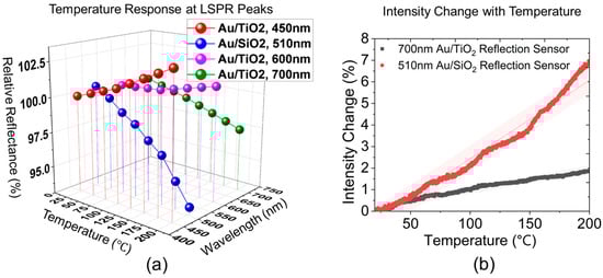 (a) Temperature responses demodulated at individual LSPR peaks of Au/TiO2 sensor compared to the dominant LSPR peak (510 nm) of Au/SiO2 sensor. (b) Percent change in relative reflectance of Au/TiO2 at 700 nm compared to Au/SiO2 at 510 nm as a function of temperature, with linear fit to the data within 95% prediction band.