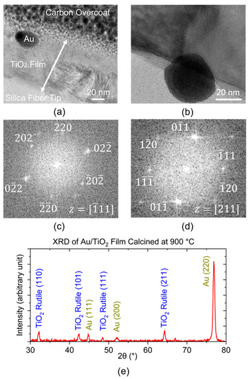 (a) Cross-sectional TEM image of post-temperature-sensing Au/TiO2 film, with Au NP embedded in the TiO2 matrix. (b) HRTEM image of a representative Au nanoparticle at the interface between the silica fiber tip and TiO2. (c) FFT pattern obtained from the Au nanoparticle in (b) along the zone axis . (d) FFT pattern of TiO2 in the surrounding region of the Au nanoparticle along the zone axis [211]. (e) Grazing incidence XRD pattern of a reference Au/TiO2 planar sample on quartz disc made by the same recipe as the fiber sample in (a).