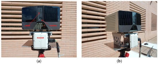 The sensors used on the testbench include: (a) a L3CAM sensor consisting of a lidar and an RGB camera on the top and (b) a UMRR-96 Type 153 radar sensor at the bottom.