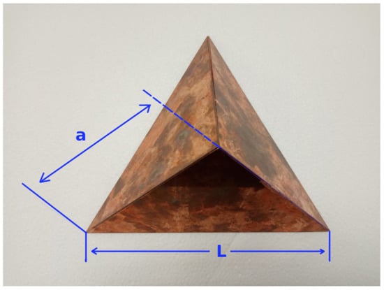 A custom trihedral corner reflector made of copper plates showing the side length edge of the three isosceles triangles and the base of the triangles .