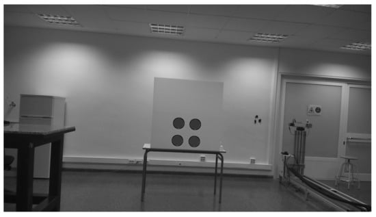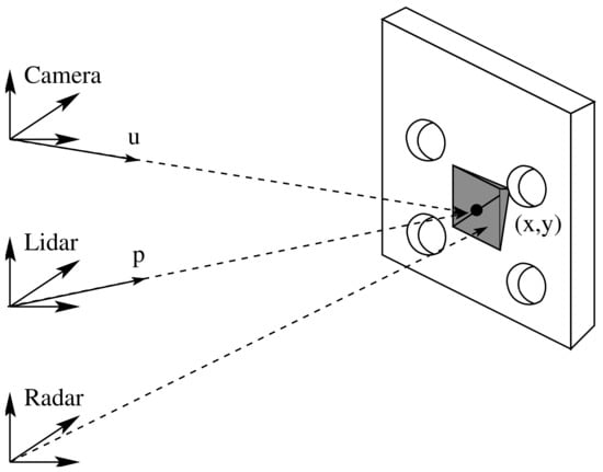 Figure 5 shows the calibration board and the corner reflector, as well as the lidar and radar frames. Figure 6 depicts the four circles’ centers (), the middle point (x, y), and the two lines (). Based on classical analytical geometry [34], two equations that correspond to were obtained—Equations (3) and (4). Then, by solving the previous equations, a crossing point (x, y) in pixels was found, as shown by Equations (5) and (6).