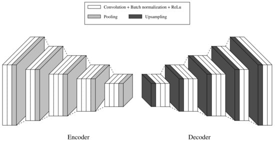 The proposed CNN network to handle the sensor fusion approach is based on [21,24]. Figure 7 illustrates the SegNet architecture used in this work. It consists of an encoder and a decoder network, with 26 convolutional, 5 pooling, and 5 upsampling layers, respectively. The function of the encoder network (EN) is to downsample the inputs and extract features. On the other hand, the decoder network (DN) upsamples the data and reconstructs the image. A fully connected layer between the EN and the DN is discarded with the purpose of retaining higher resolution feature maps at the deepest encoder output.