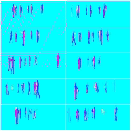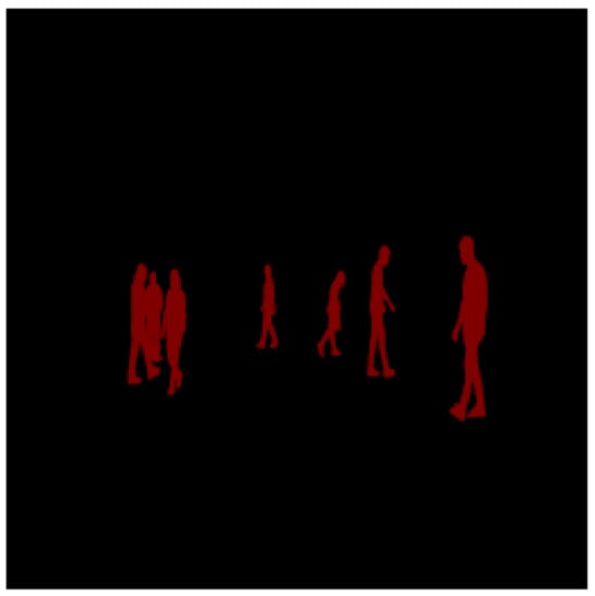 The results of the testing mode are displayed in Figure 25, where the ground truth and the model’s output are overlaid. The model’s detection of pedestrians is shown in red, which represents the overlapping area with the ground truth. The white spots near and between the pedestrians are part of the model’s output but do not overlap with the ground truth. Light blue depicts weakly detected pedestrians, which was a result of the model’s overfitting and the limited size of the training data. This can be confirmed by the loss of 1.413 between the output and ground truth.