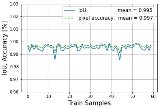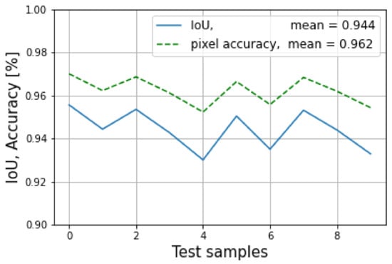 The results of the evaluation mode are shown in Figure 23, where the blue line indicates the average loss of the training mode and the orange line indicates the average evaluation loss. It can be seen that the model started overfitting around epoch 50, with a lowest loss value of 1.411. At this point, the model was saved for use in the testing mode. In addition, the IoU and the pixel accuracy for the testing mode is shown in Figure 24, where the mean of the IoU was 94.4%, and the pixel accuracy was 96.2%.