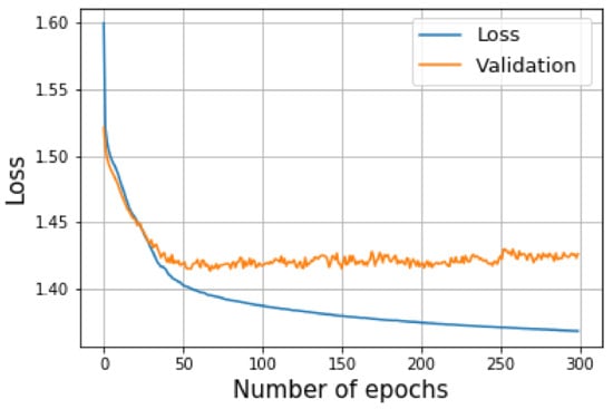 The blue line represents the loss of the training mode and the orange line indicates the loss of the validation mode.