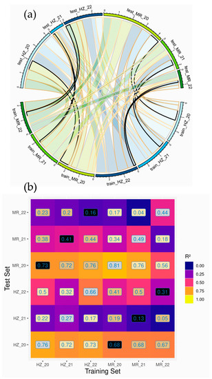 Visualization of coefficients of determination (R2) for the train*test set combinations for the ‘full models’ based on all matched measurement days (‘all times’). Green (MR) and blue (HZ) colors in (a) denote the locations, color intensity the three years, respectively. The width of the connecting bars represents the R2-levels and the outer, circular bars the cumulative R2-values in the test evaluation. Boundary colors in (a) and label background colors in (b) denote the dataset combinations (W: within, A: across, Y: year and L: location): WYWL (grey), WYAL (black), AYWL (light beige) and AYAL (dark beige).
